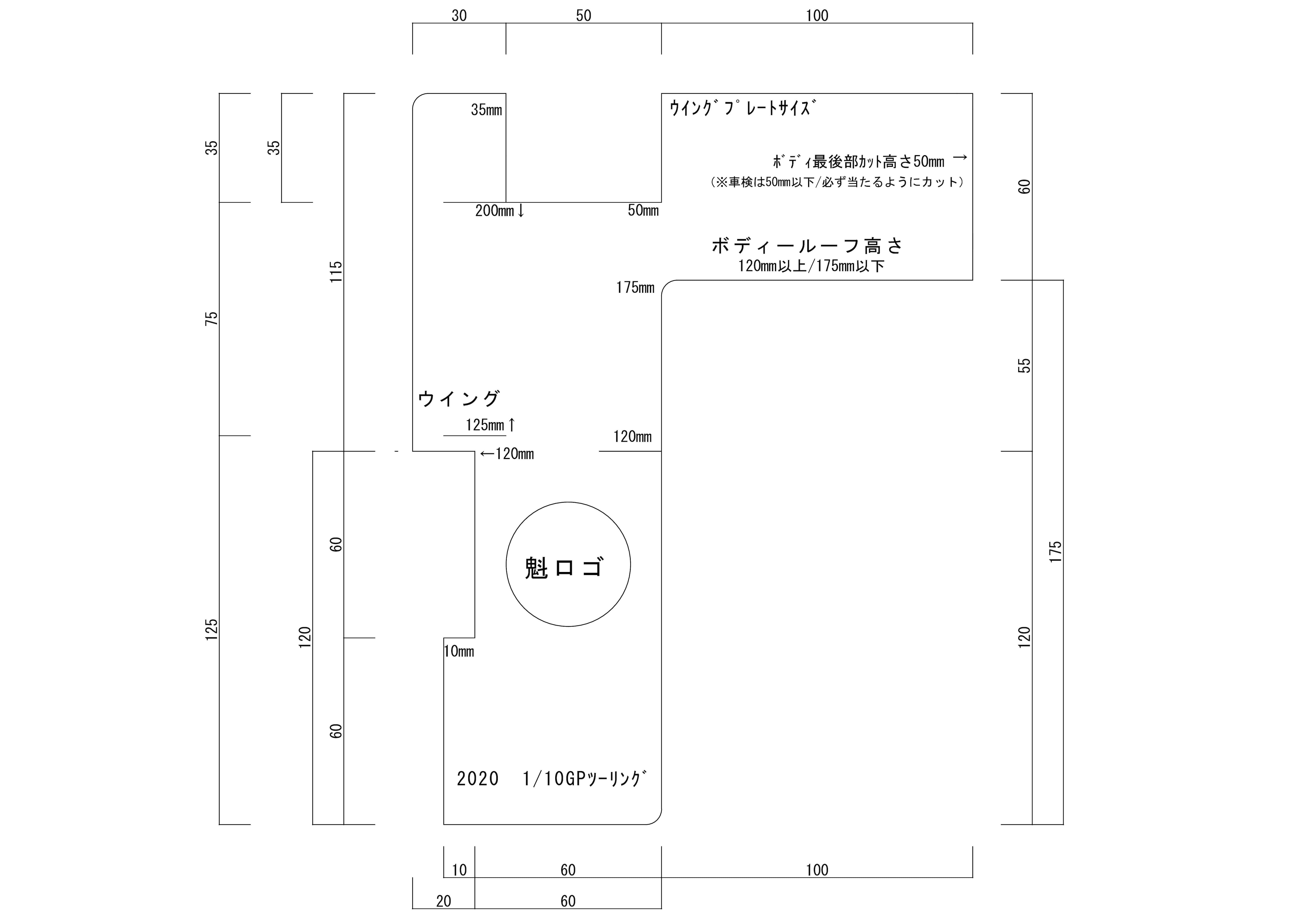 ウイング取付位置は「 ウイング、スポイラー、翼単板は、ボディー最後部より後ろ 10mm、及び地上 120mm より高い位置に一部でもはみ出してはならない。 」