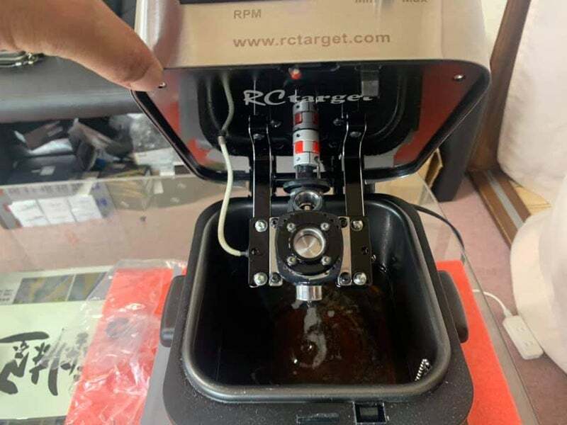 海外製のラジコン用オイル慣らし機械を使用して、エンジンの慣らし作業を行います。